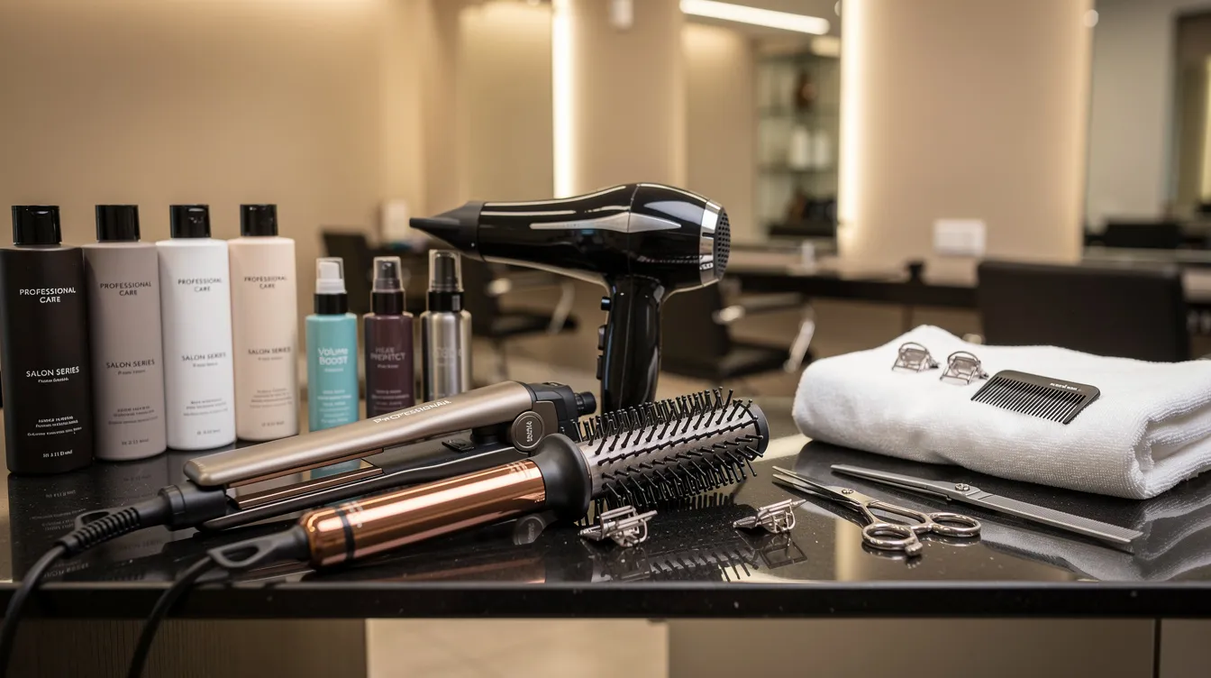 The image depicts a modern salon setting featuring an array of professional styling tools and hair products, including flat irons and sulfate-free shampoos, ideal for both hair stylists and clients seeking treatments like Brazilian blowouts or color services for vibrant, healthy hair. The organized display reflects a focus on achieving glossy finishes and reducing frizz for beautifully styled hair.