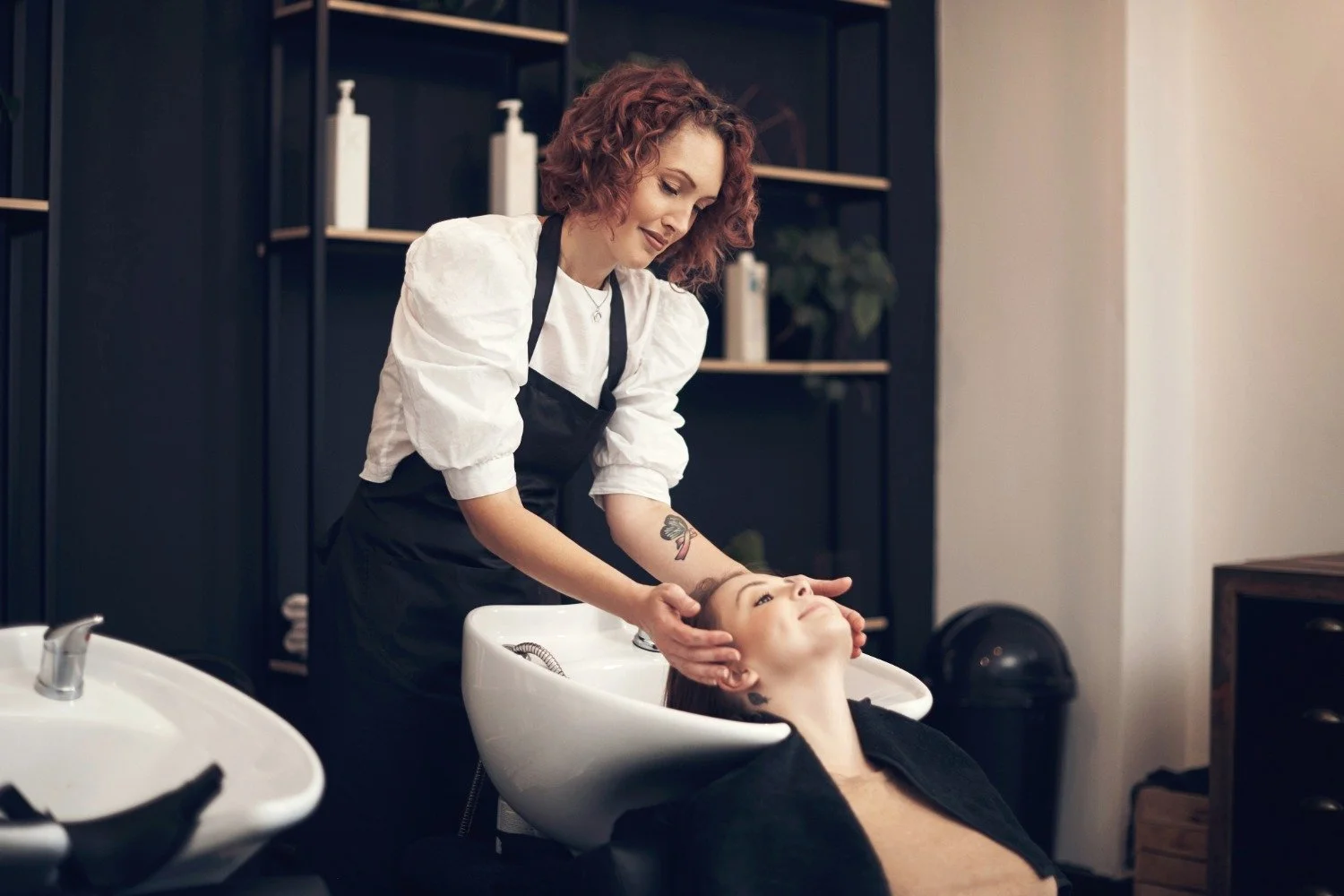 Hair stylist washing a clients hair during a keratin treatment in the salon
