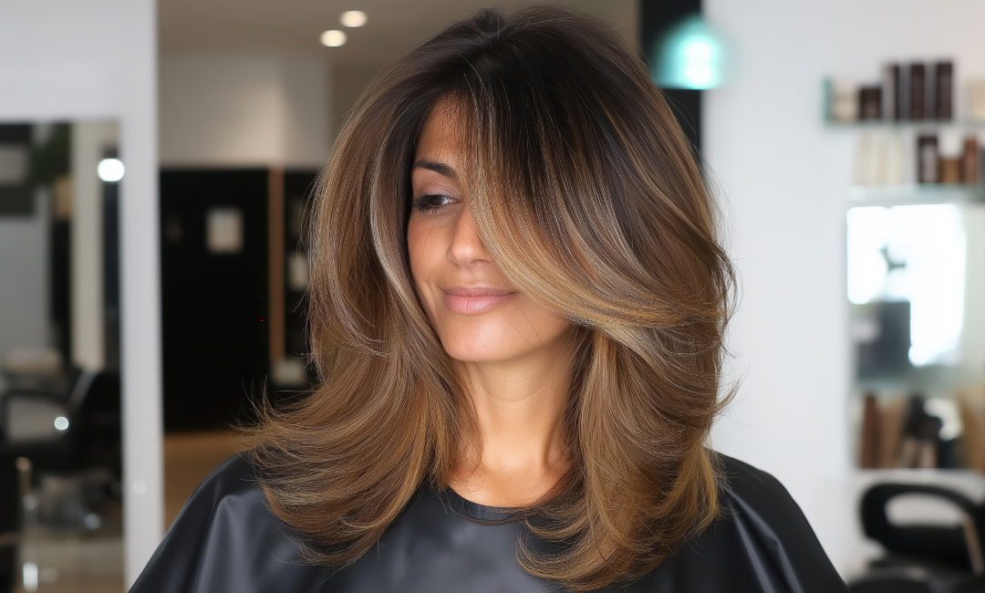 A woman with long layered hair showcases natural movement and shine, highlighting the choppy layers that add depth and volume to her hairstyle. The light reflects off her polished hair, creating a flattering look that exudes confidence and warmth.